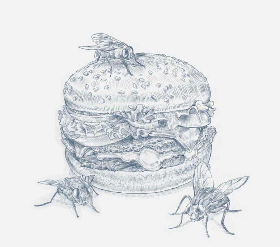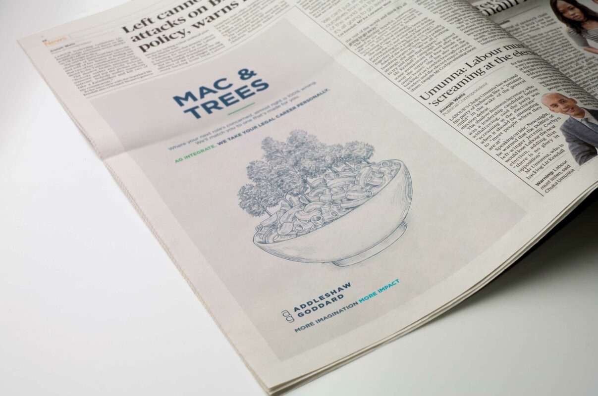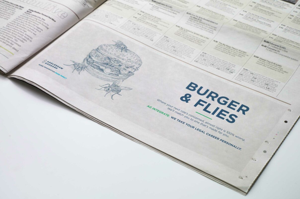 So we created pairings that were almost right, but 100% wrong: Fish and Chipmunks, Burger & Flies, Knife & Forklift. Powerful, eye-catching, thought-provoking, lip-twitching copy lines we then brought to life with intentionally detailed pencil illustrations to complement the long-running line-art style of Addleshaw Goddard.