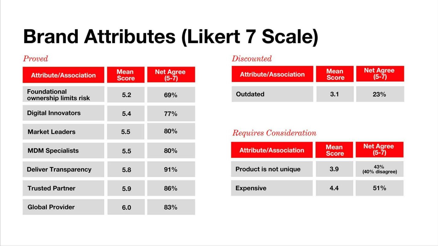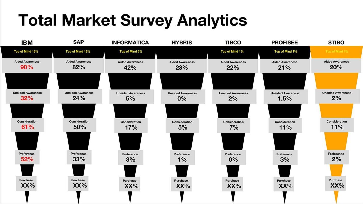 A set of very tight and well-considered hierarchy of questions built us a complete and highly-instructive sales funnel to give us a market view through Awareness – Consideration – Preference – Purchase. The questions were designed to illicit key information around segmentation, awareness, and measuring Stibo’s brand associations and how these associations stack up compared to their competitors, as all as giving us a very clear insight into what was driving the different stages in the funnel.