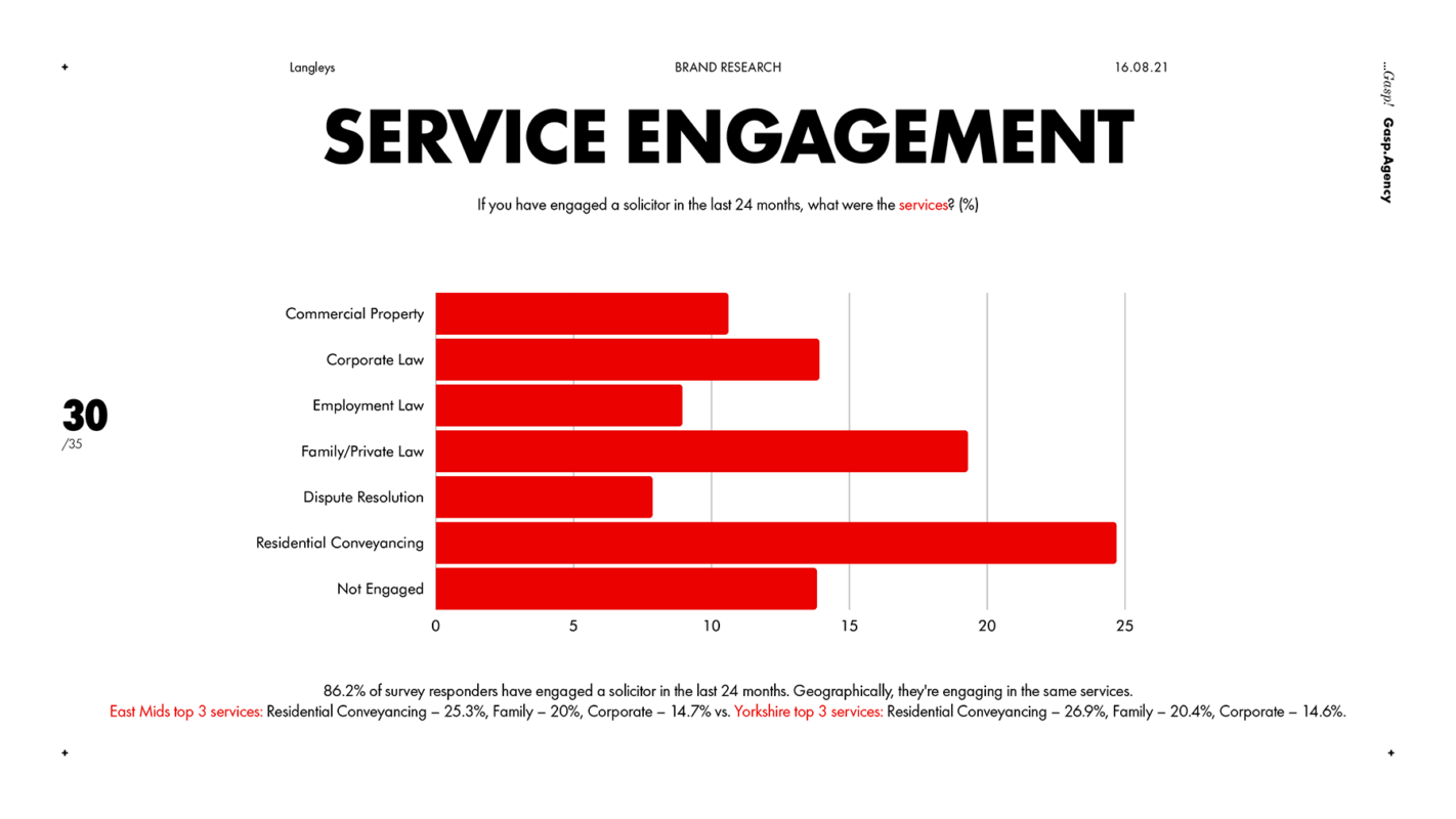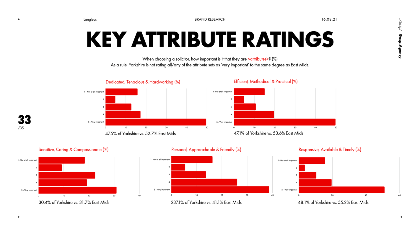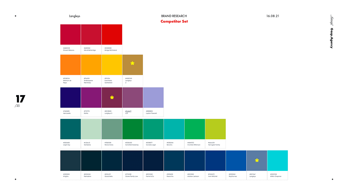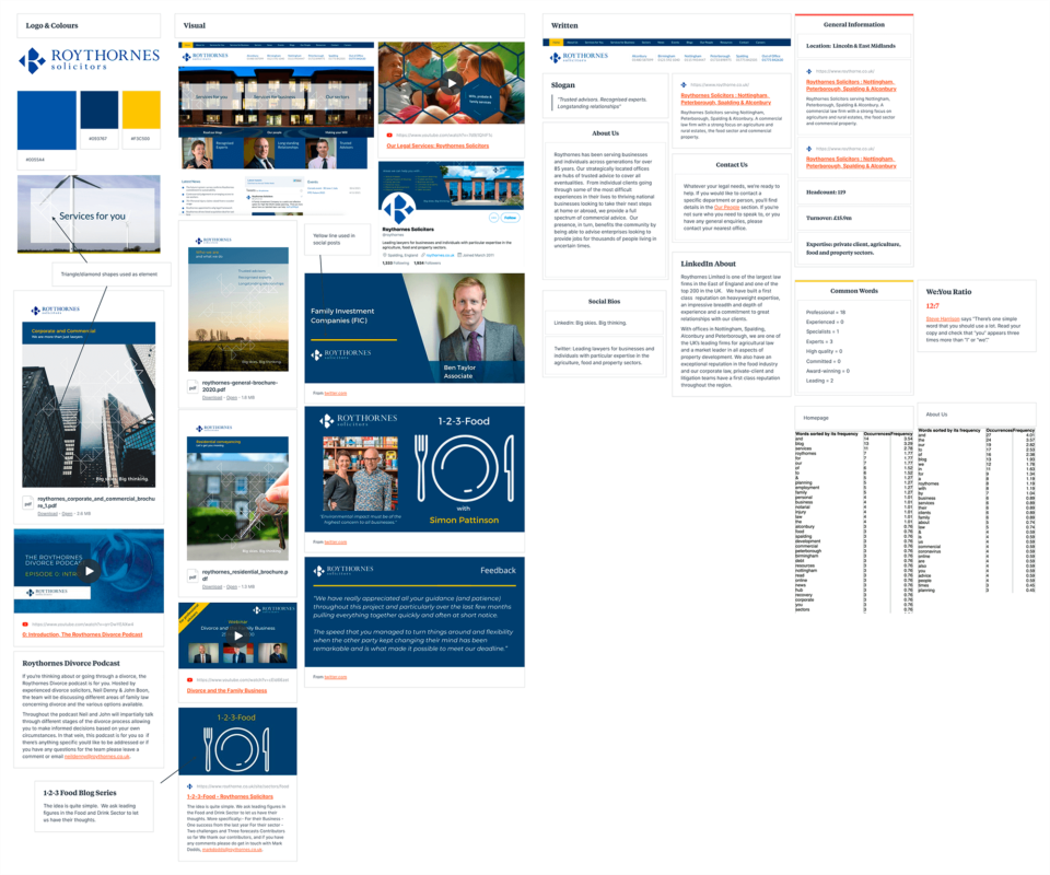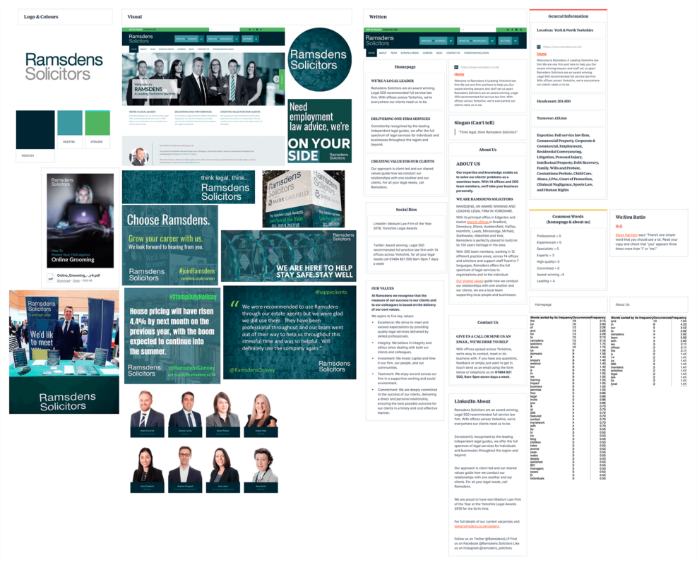 The client had already done an extensive and excellent job of understanding how they were perceived. We validated this and enriched it by combing through a set of 30+ law firms across Yorkshire and the East Midlands, taking record and measures of brand codes including logos, slogans, colours, tone, word frequency and more. Now we had a baseline.