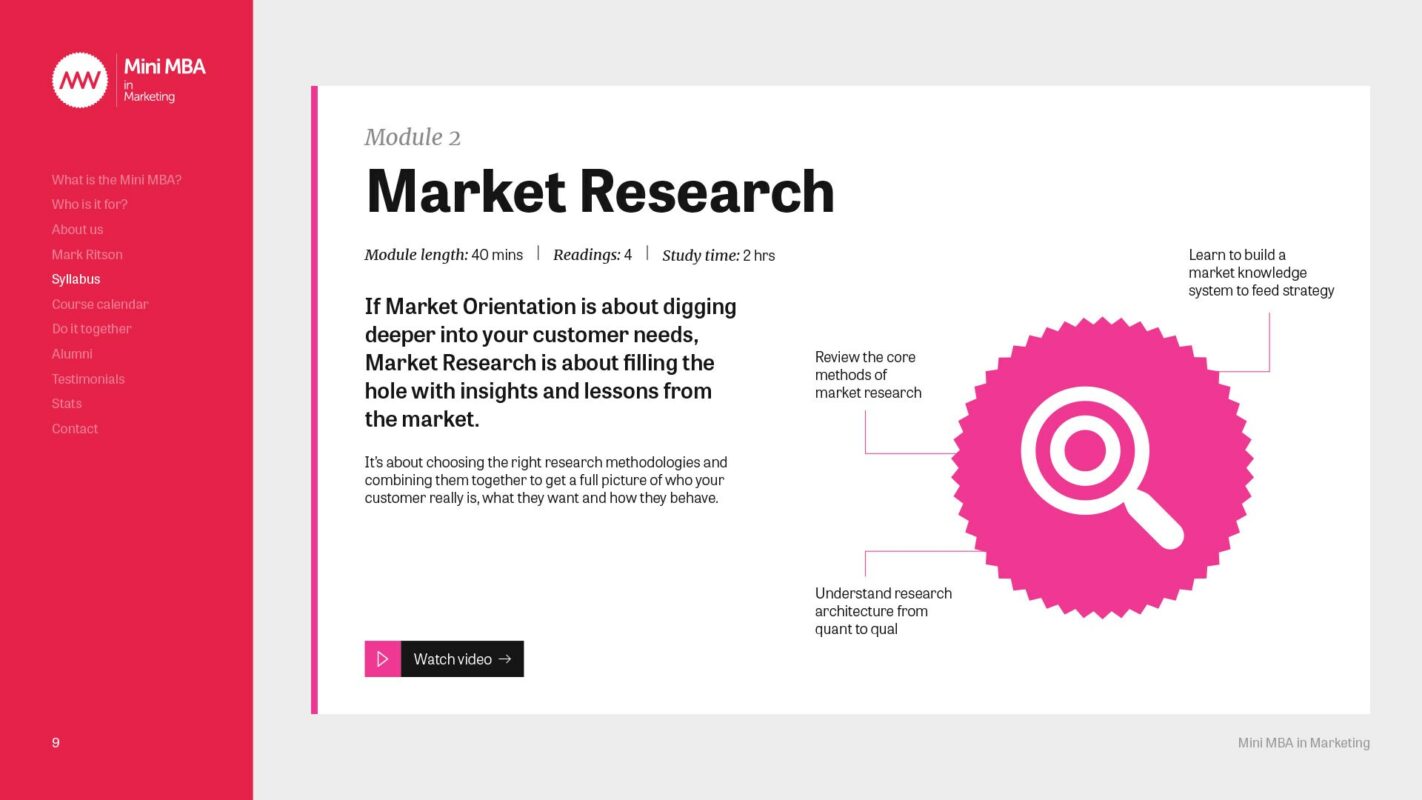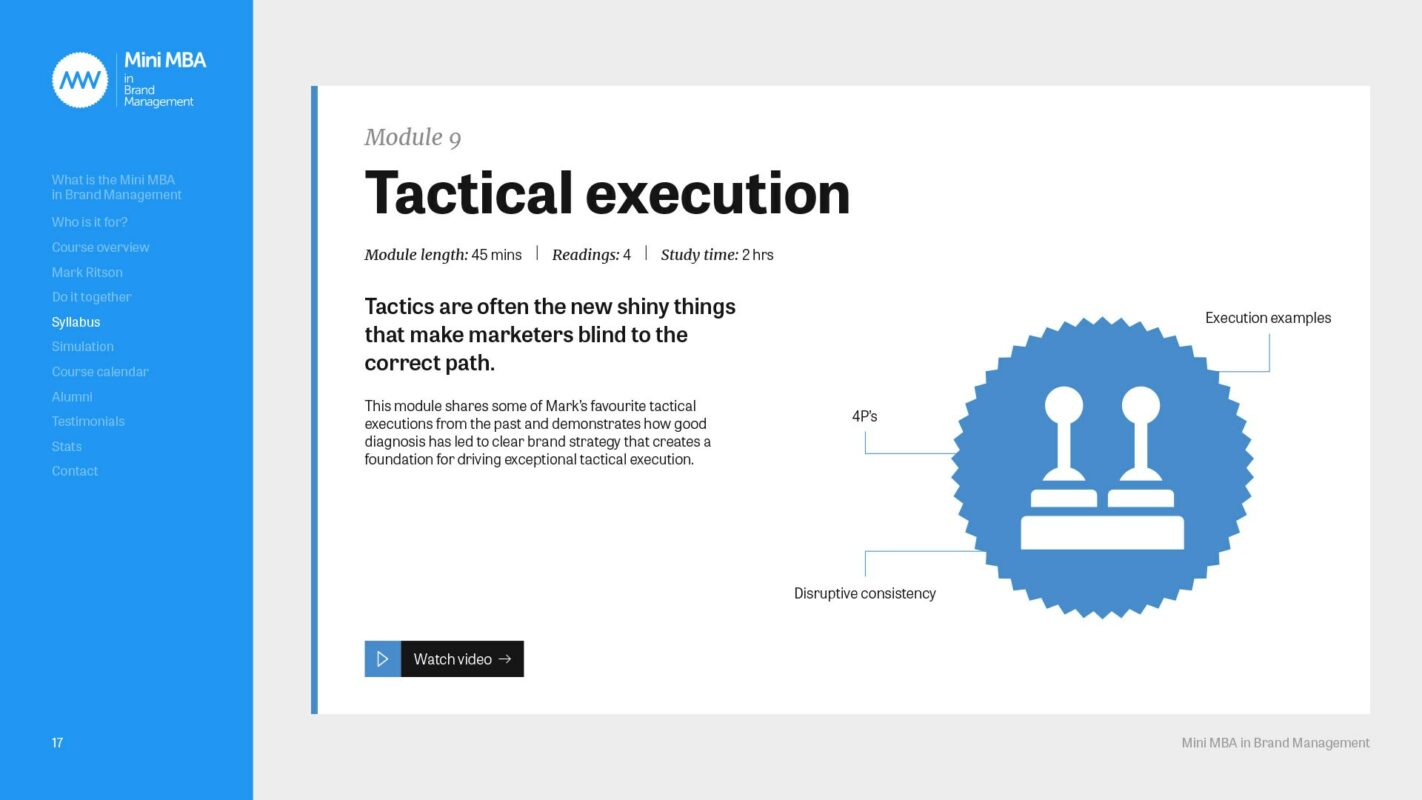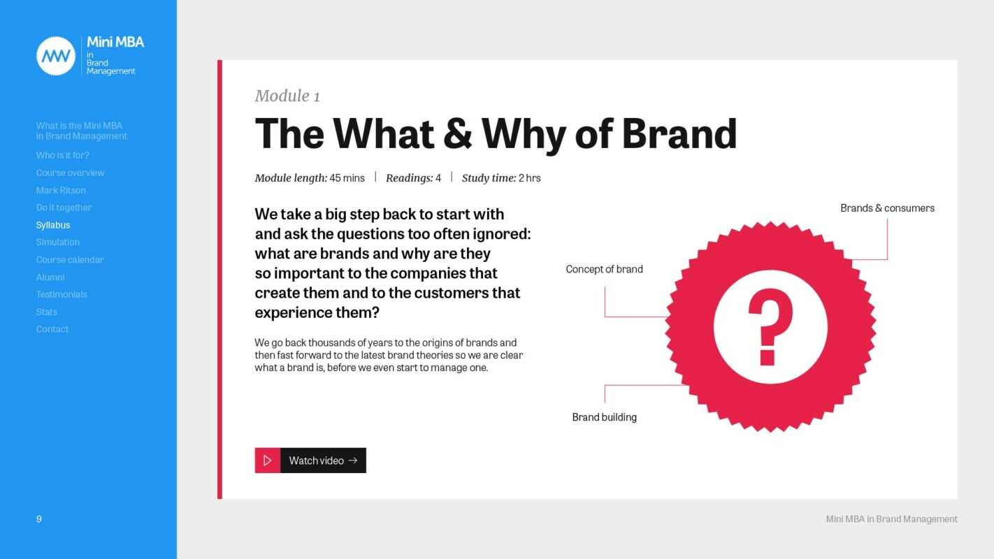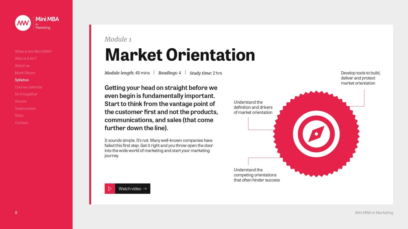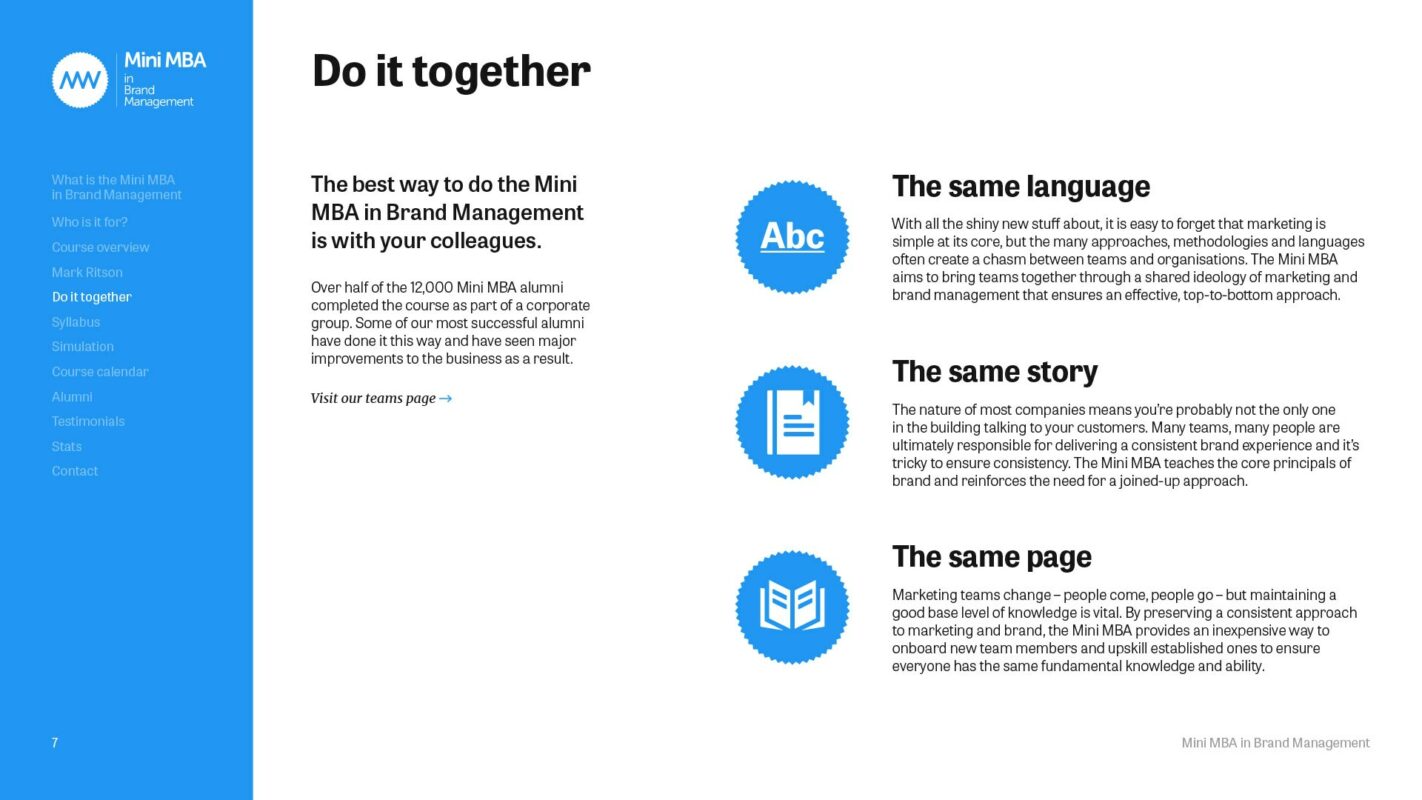 The team behind the Marketing Week Mini MBA series needed guidance on how to talk consistently in the right tone when creating content and comms for the Mini MBA programme; anything from website copy to module descriptions and sales brochures. Crucially, they needed clarity and direction on distinguishing between and using Mark Ritson’s iconic and forthright voice, and that of Marketing Week itself.