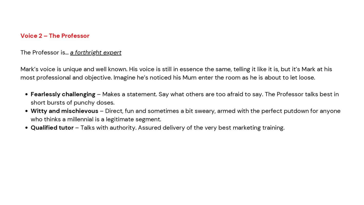 Clearly, having such a huge asset and leader in Mark Ritson on the course was a massive plus, yet this also was arguably the biggest part of the Tone of Voice challenge as we actually need to develop two; The Institute (Marketing Week), and The Professor (Mark Ritson).