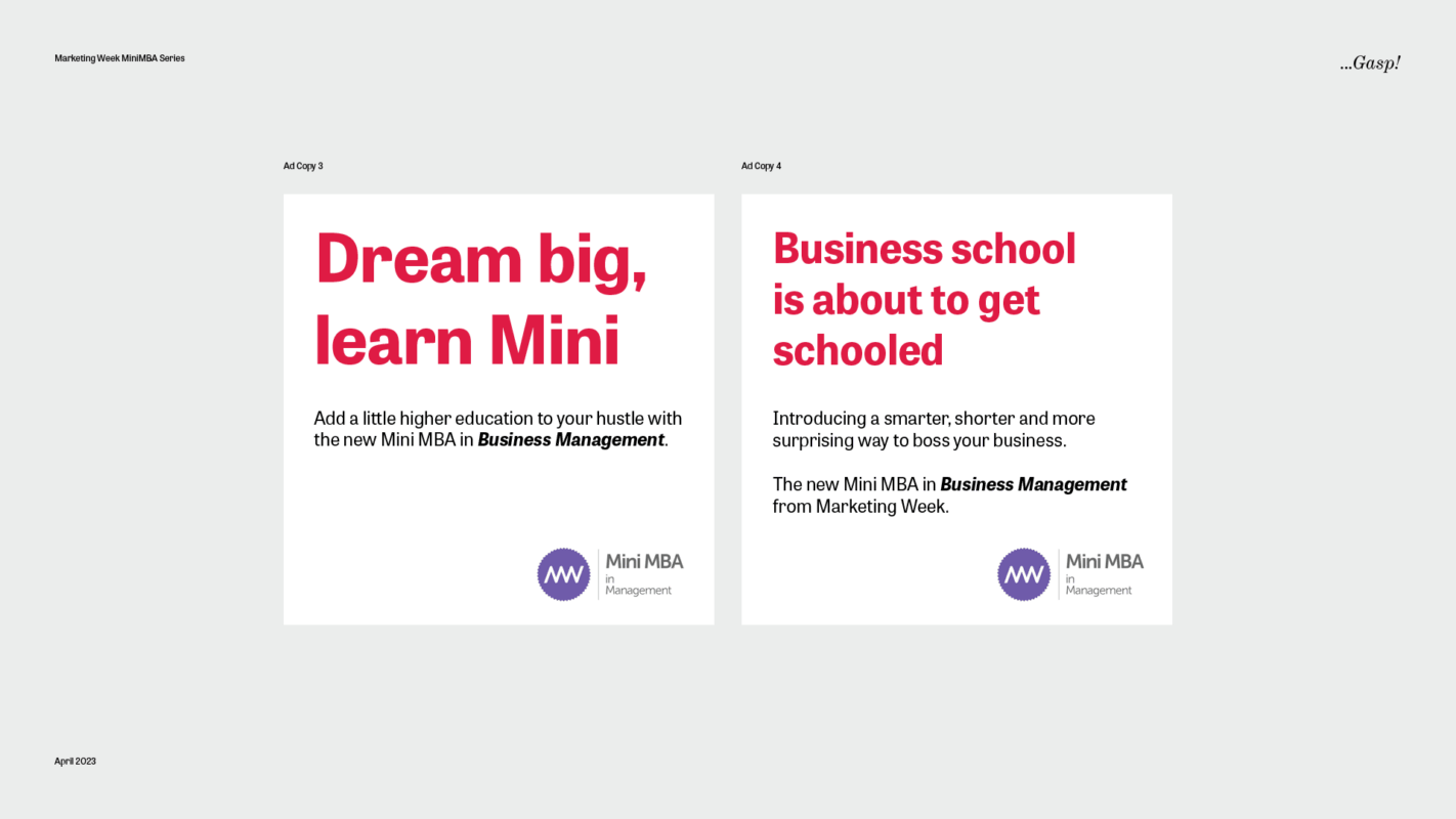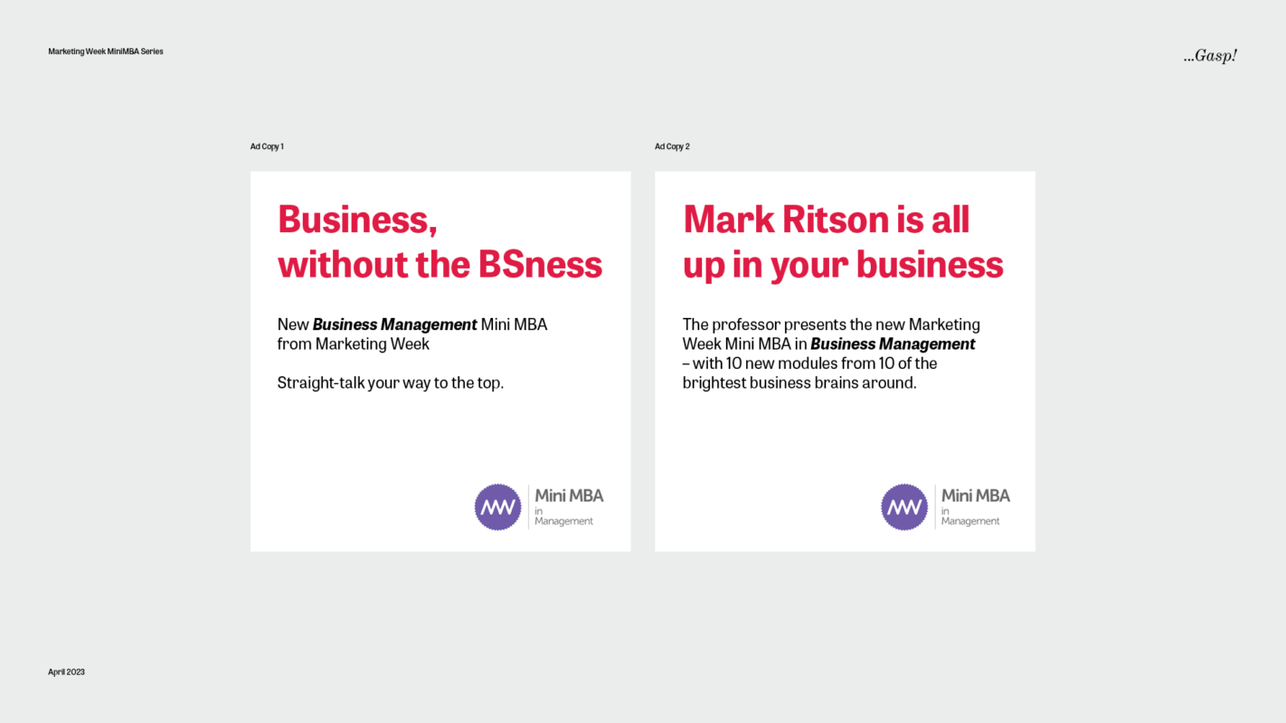 Nerve-wracking as it may seem to create marketing material for one of the world’s greatest marketers (a little like knocking up a cheese toastie for Gordon Ramsey) the …Gasp! team worked closely with the Mini MBA folks to communicate the two new programmes across websites, brochures and through some highly Ritson-esque campaign ads too.