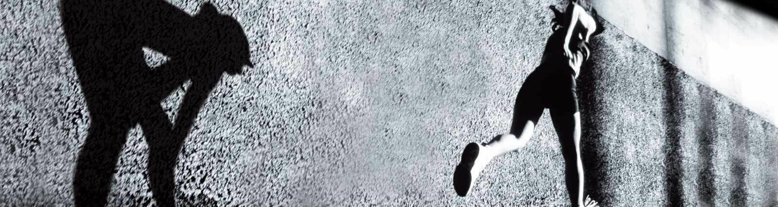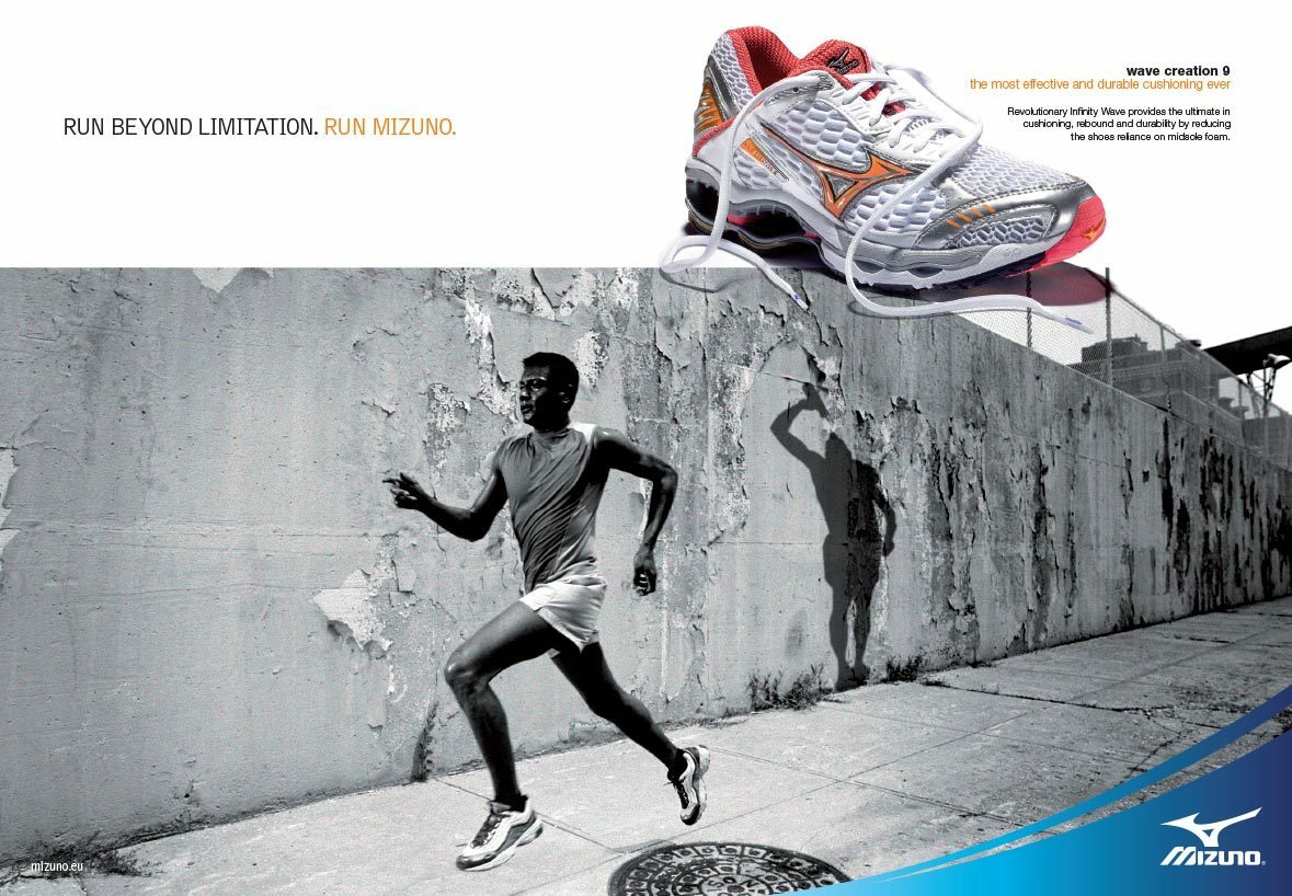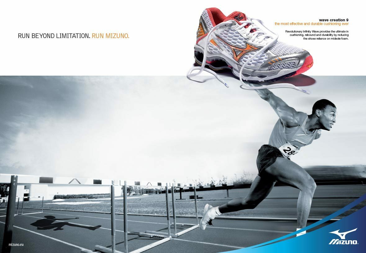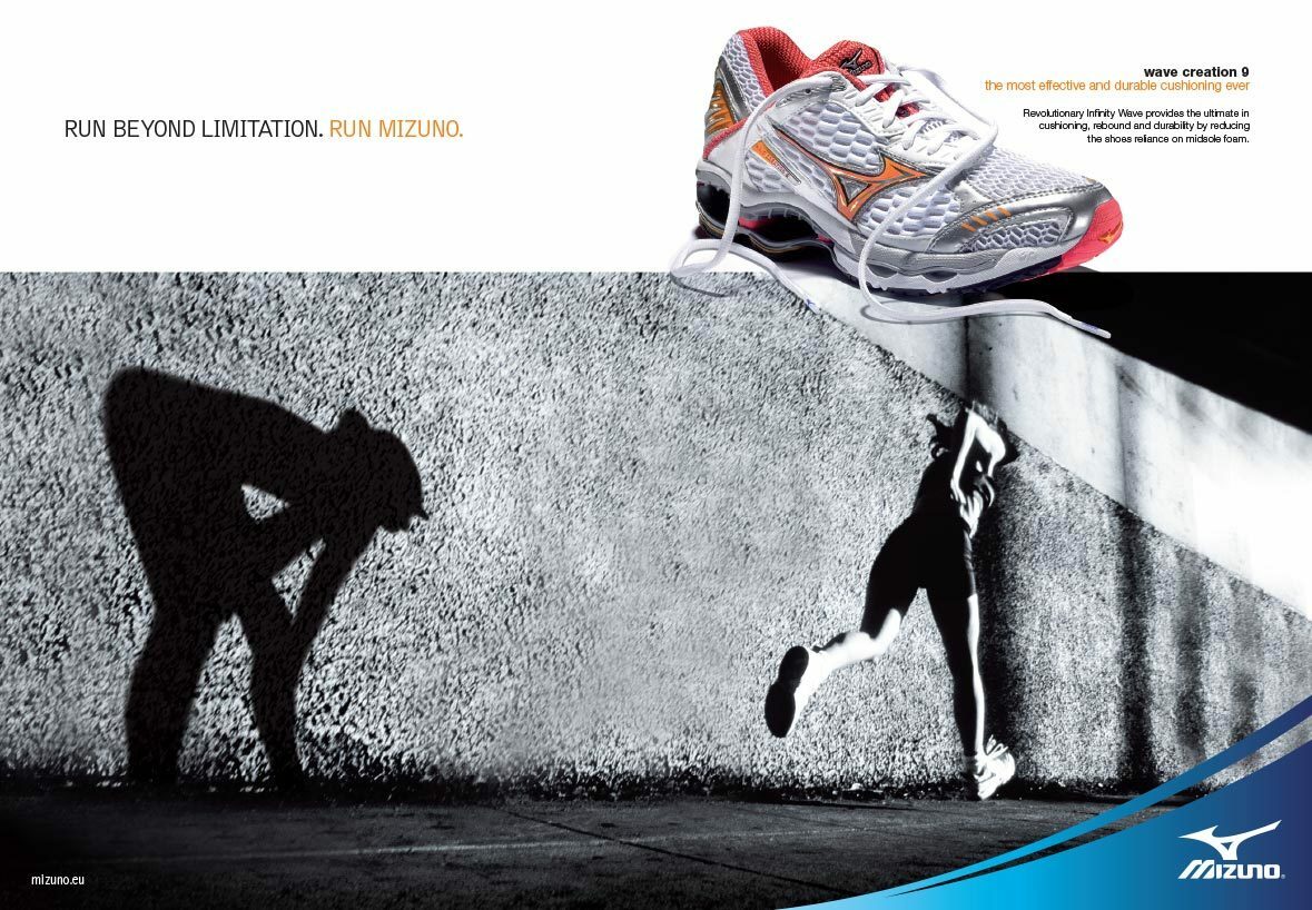 We came up with several striking visuals for a campaign that was entitled ‘Run Beyond Limitation’. The visual is key, with little reliance on copy. Dramatically lit black and white images accentuated the athlete surpassing their own limits. They have outrun their own shadows, which mark the previous point of their best performance. The athletes bound on into the unknown, achieving what was previously beyond them. An overlaid image of the colourful product juxtaposes with the monochrome lead image, whilst the Mizuno logo rests on a sweep of blue.
