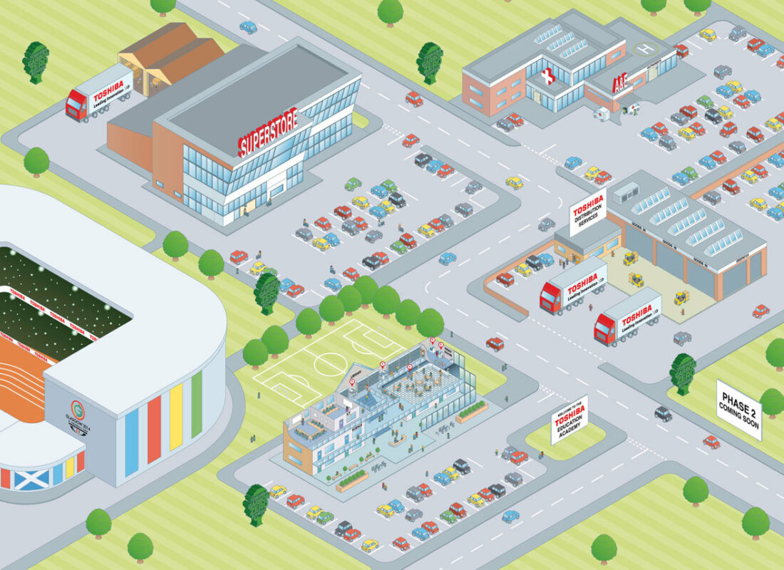 At the time, Toshiba were one of the official sponsors of the Commonwealth Games, providing Glasgow with a comprehensive office automation solution, so we thought it would be a nice touch to herald this by building a sports stadium into our mini Toshiba town.